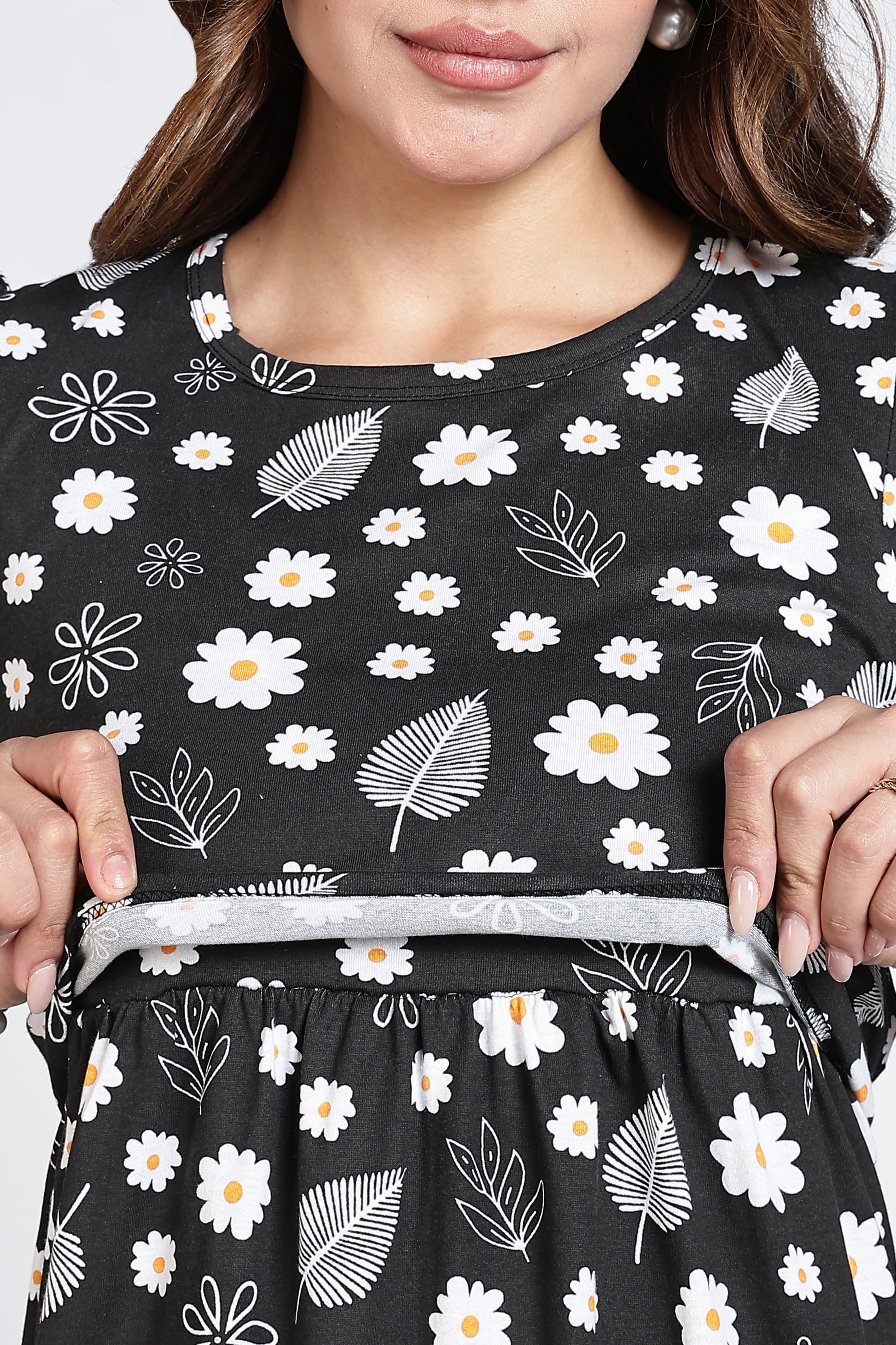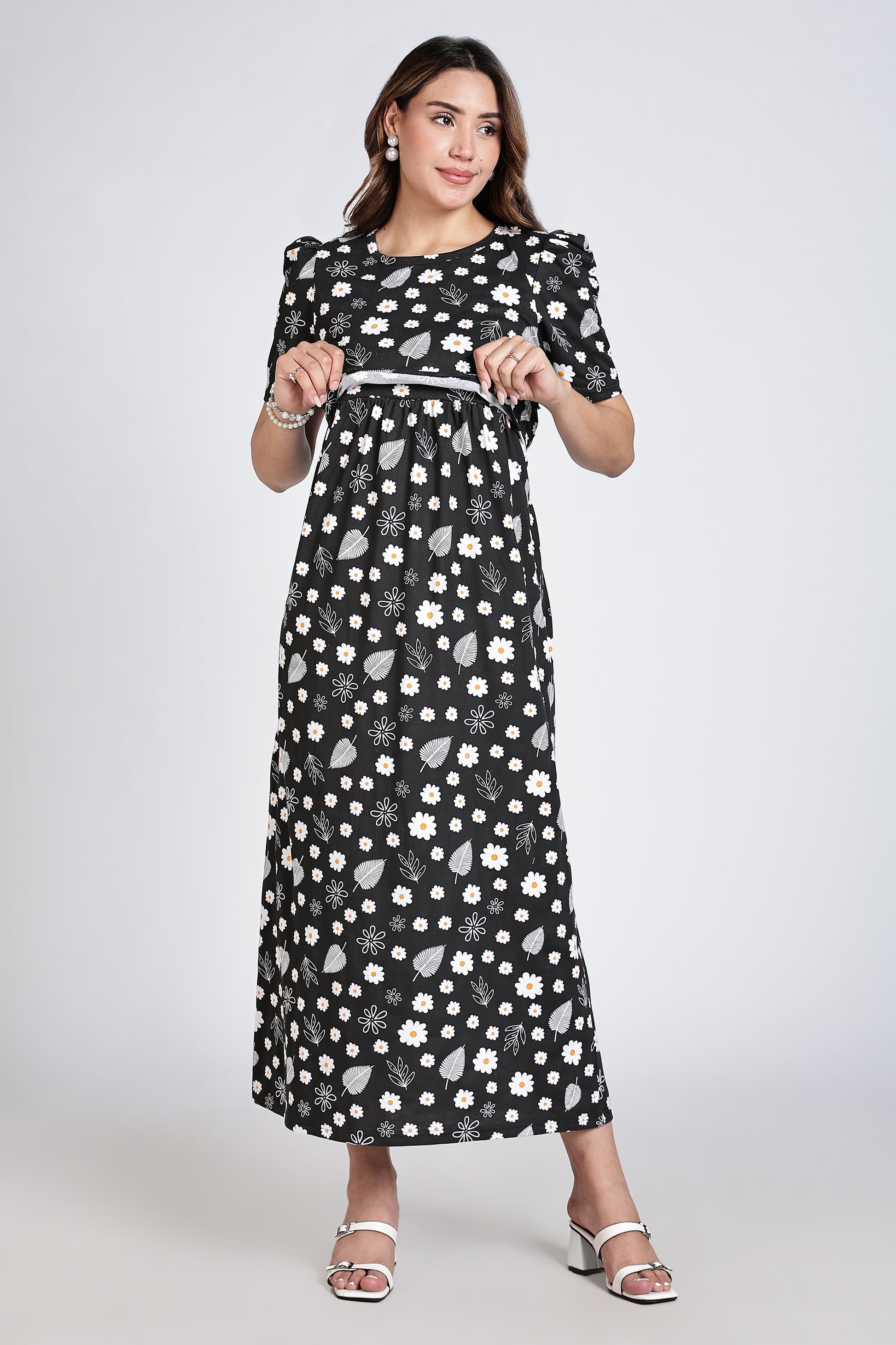 Soft and Breathable Maternity Feeding Gown Designed for daily comfort. Zipless easy feeding access, Puff Sleeves an 52 inch graceful length For a relaxed and stylish look. Perfect for pregnancy and post pregnancy Wear.